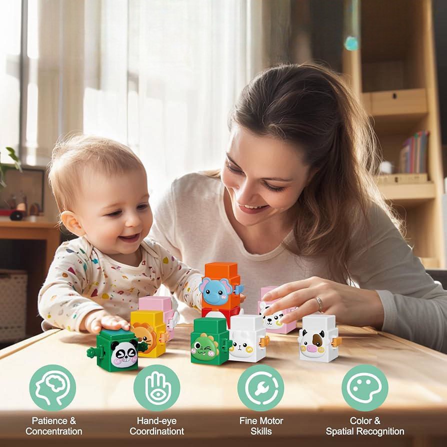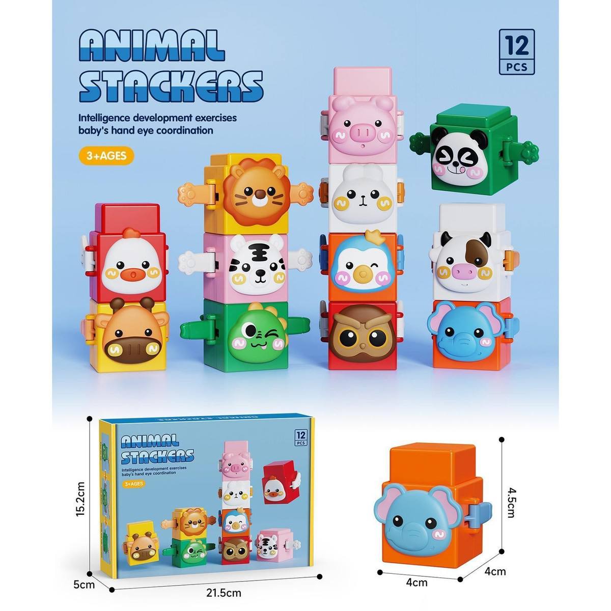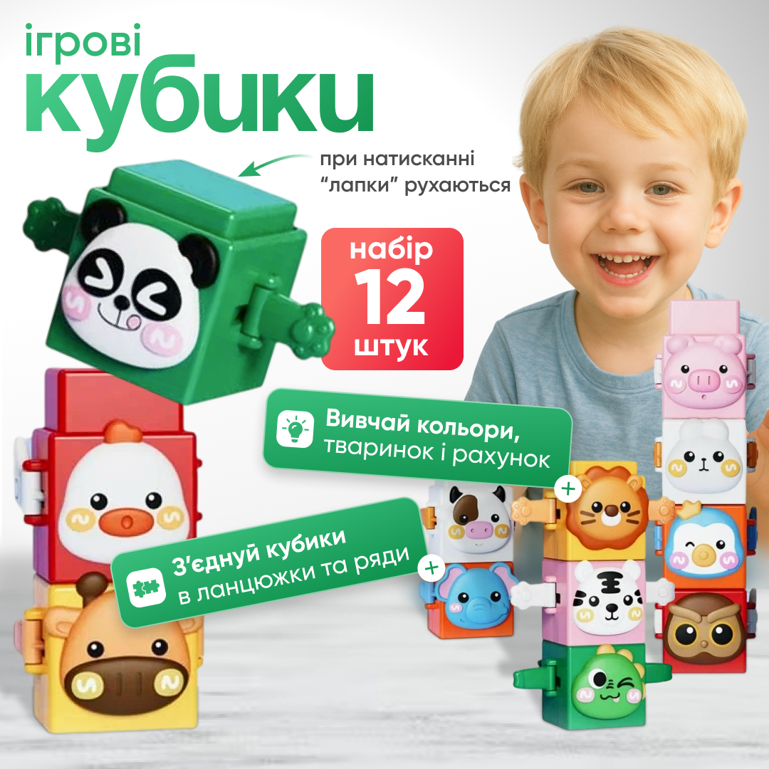 Набір розвиваючих кубиків з тваринками (12 шт) — це яскрава інтерактивна іграшка, яка допомагає малюкам пізнавати світ. Кожен кубик — це унікальна тваринка з кумедною мордочкою та рухливими лапками. Вони легко з’єднуються, складаються у вежу та дарують дитині години цікавої гри. Ідеальний варіант для розвитку моторики, уяви та логіки дитини.